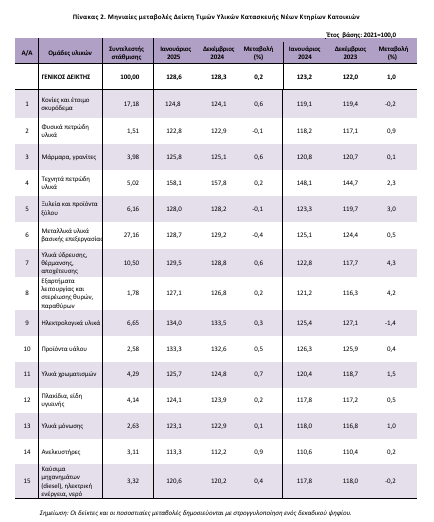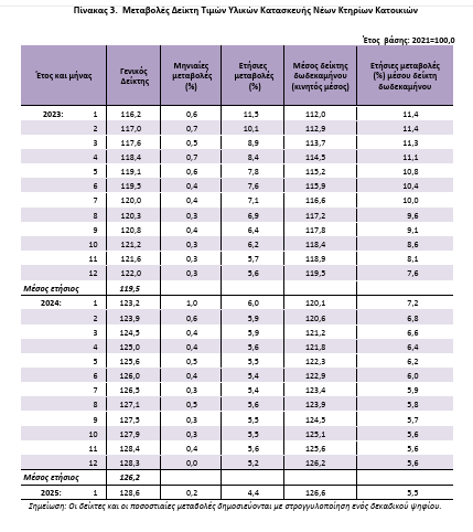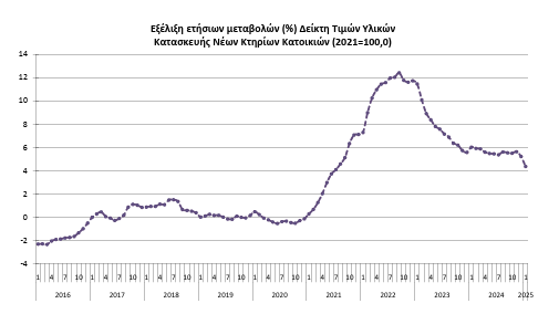 Ο Γενικός Δείκτης Τιμών Υλικών Κατασκευής Νέων Κτηρίων Κατοικιών, με έτος βάσης 2021=100,0 και μήνα αναφοράς τον Ιανουάριο 2025, σε σύγκριση με τον αντίστοιχο δείκτη του Ιανουαρίου 2024 παρουσίασε αύξηση 4,4%, έναντι αύξησης 6,0% που σημειώθηκε κατά τη σύγκριση των αντίστοιχων δεικτών του έτους 2024 με το 2023.
